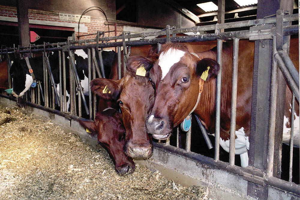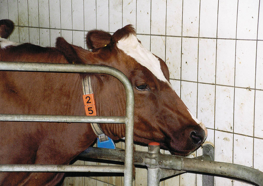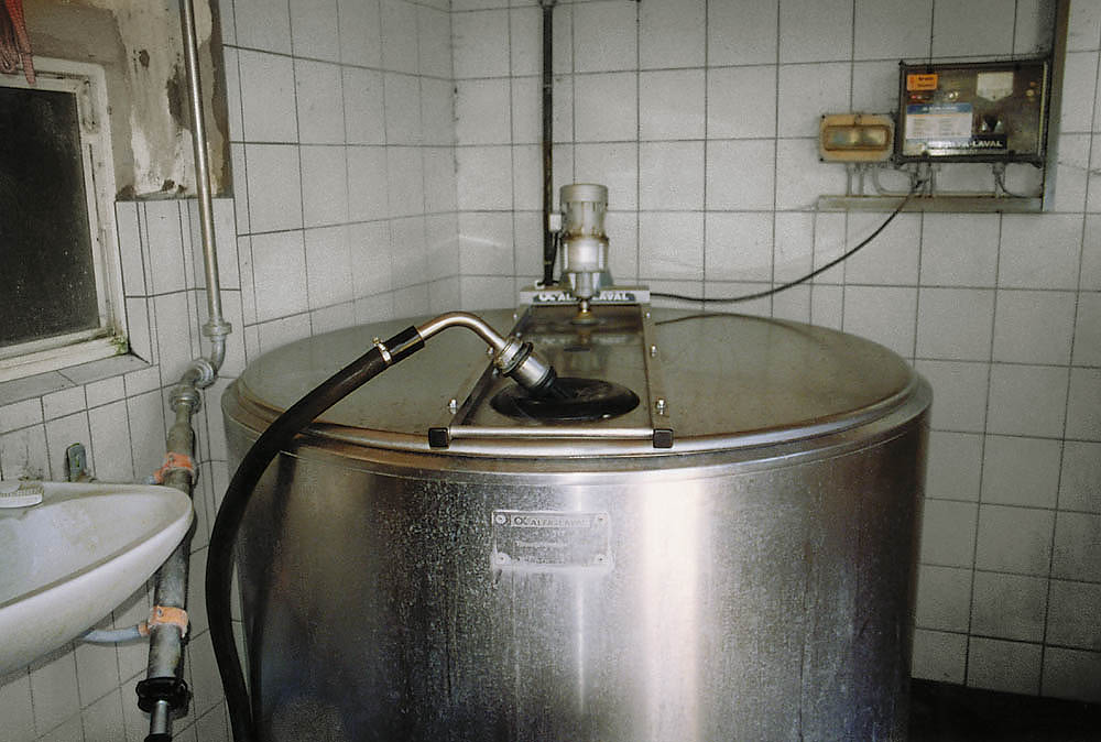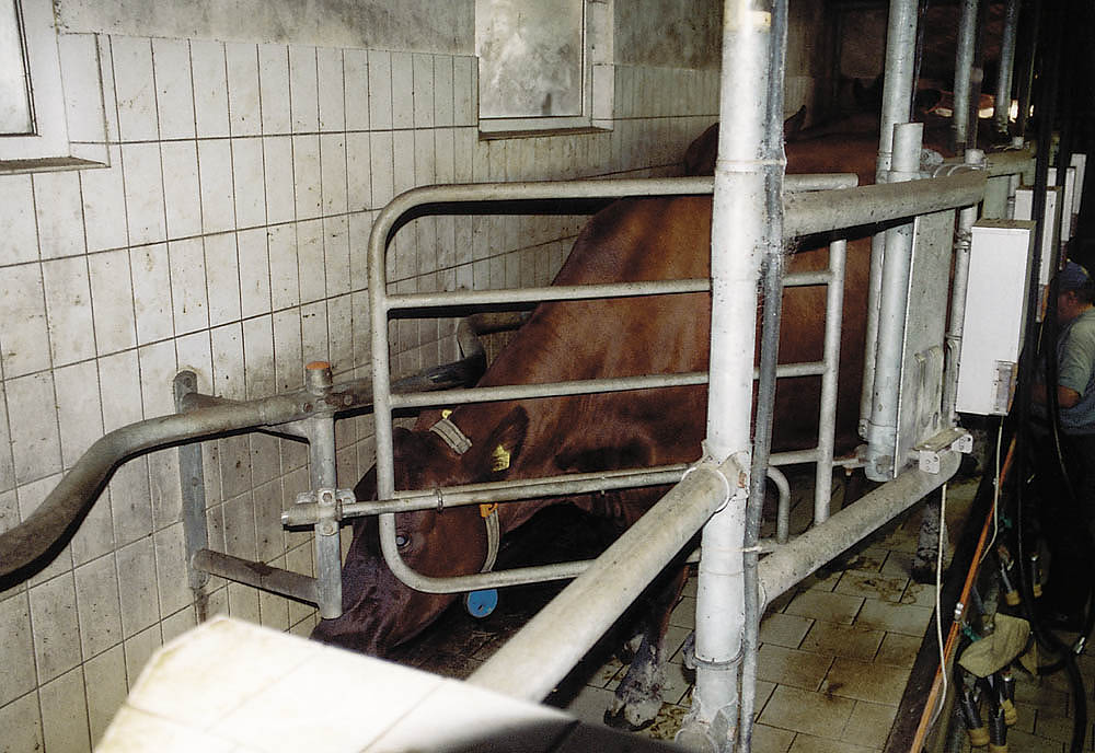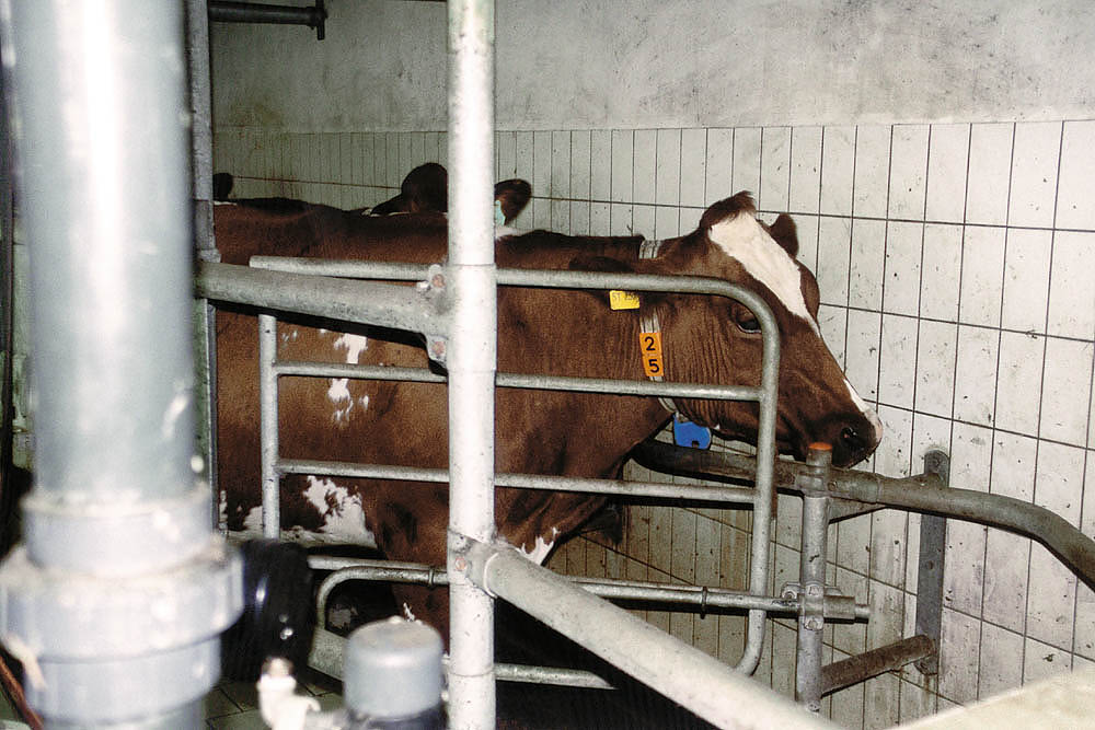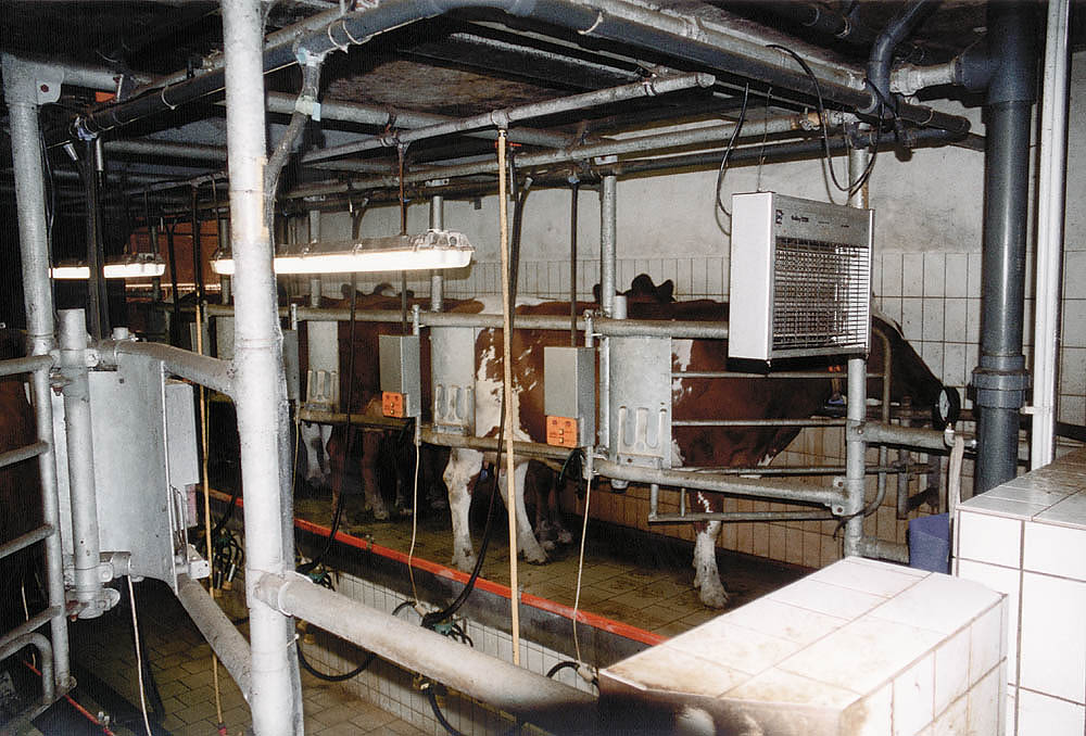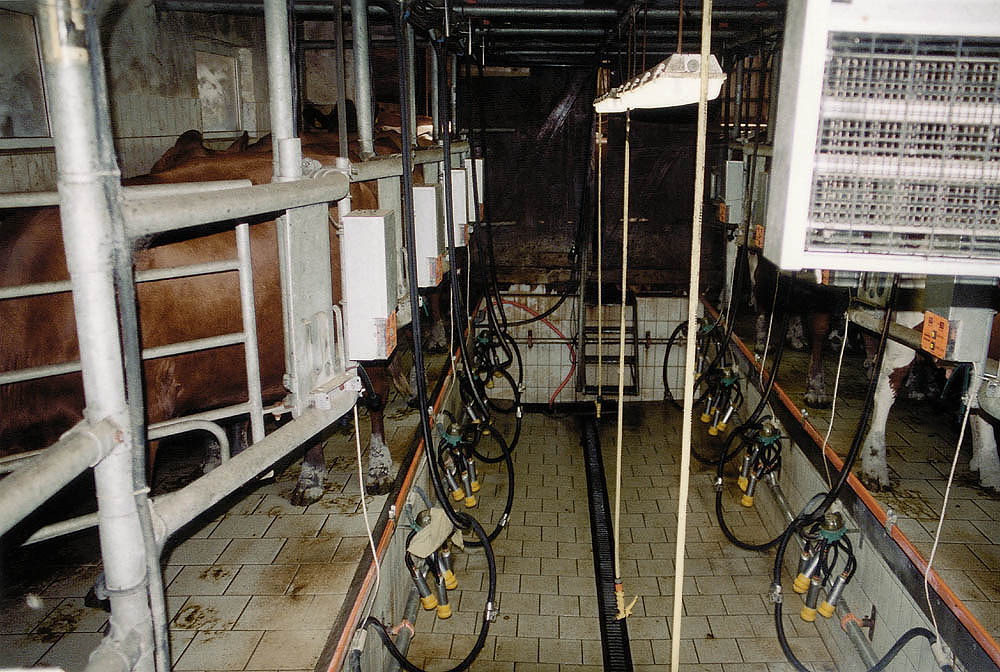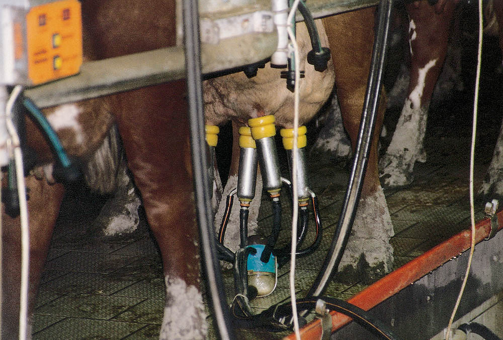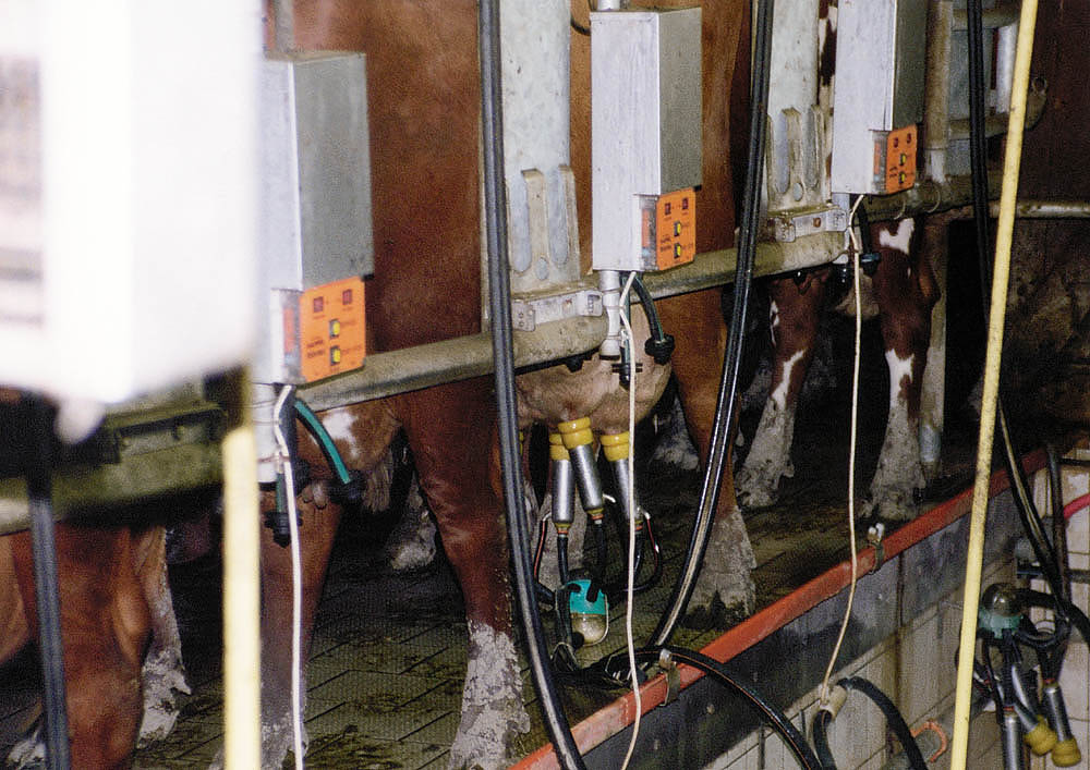 Den Kühen wird jeweils morgens und abends mit Melkmaschinen (die die Stelle des saugenden Kalbes einnehmen) die Milch abgenommen. |