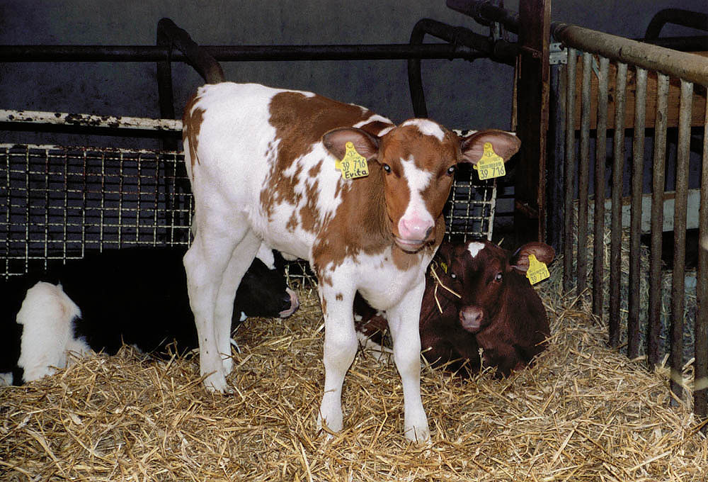 ...sowie junge Kälbchen, die geboren werden müssen, damit ihre Mütter genügend Milch in den Eutern bilden. Die Milch, die die Kühe ausschließlich für ihren Nachwuchs bilden, wird jedoch vom Menschen mit Melkmaschinen (>> siehe Bilder unten) entnommen und für den menschlichen "Eigenbedarf" aufbereitet. |