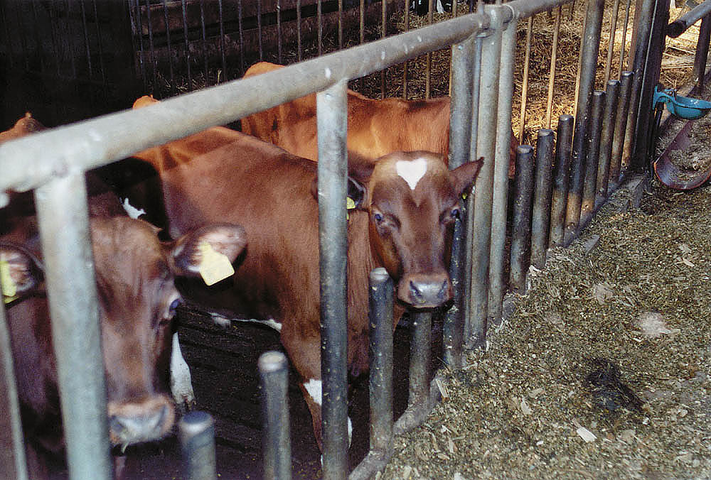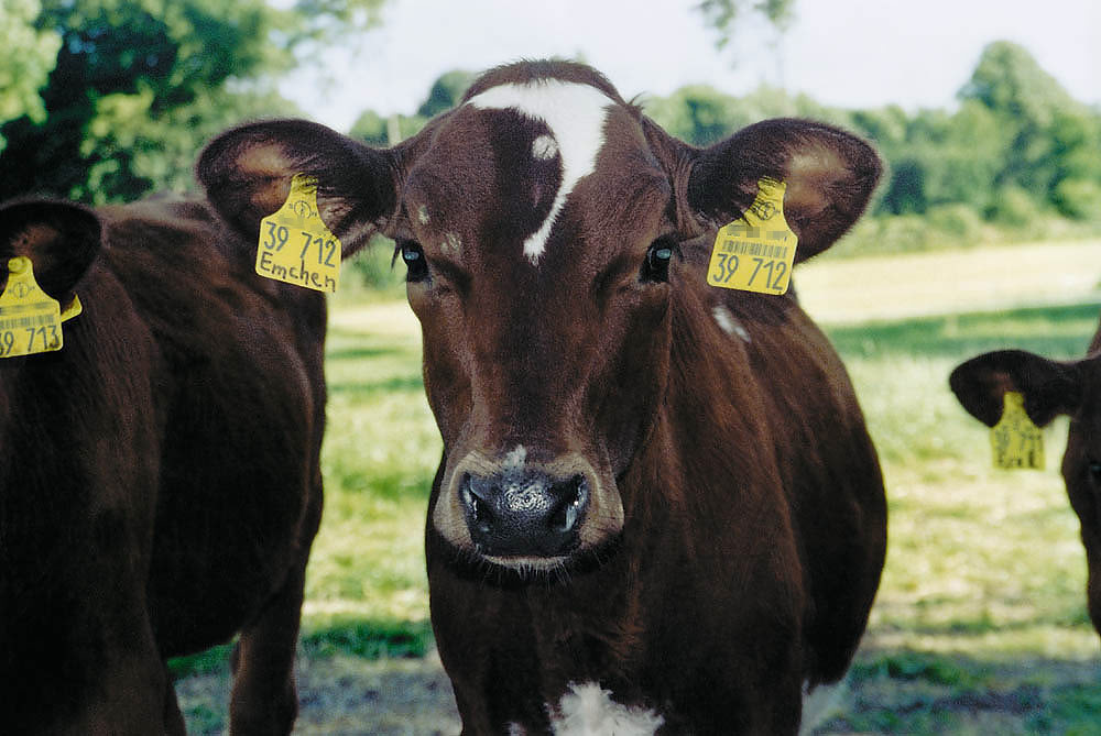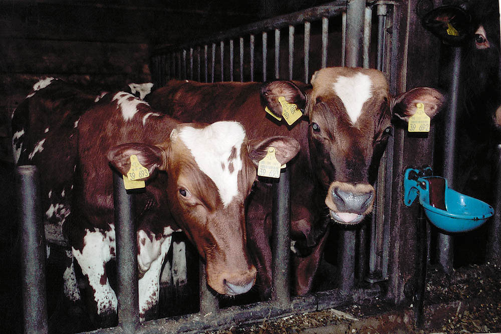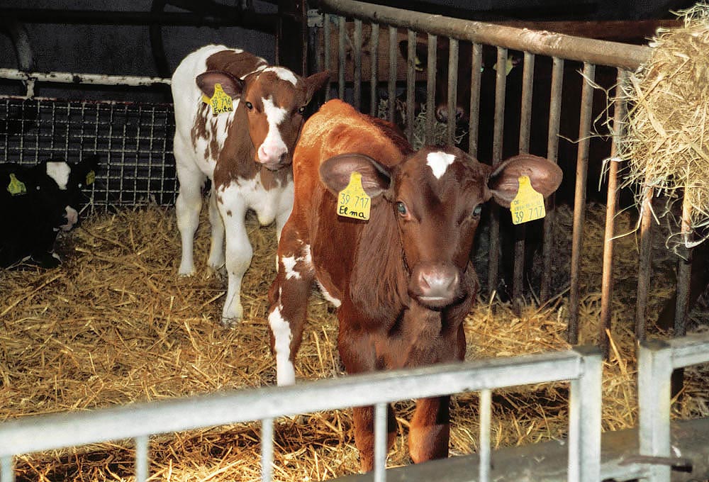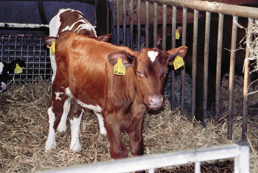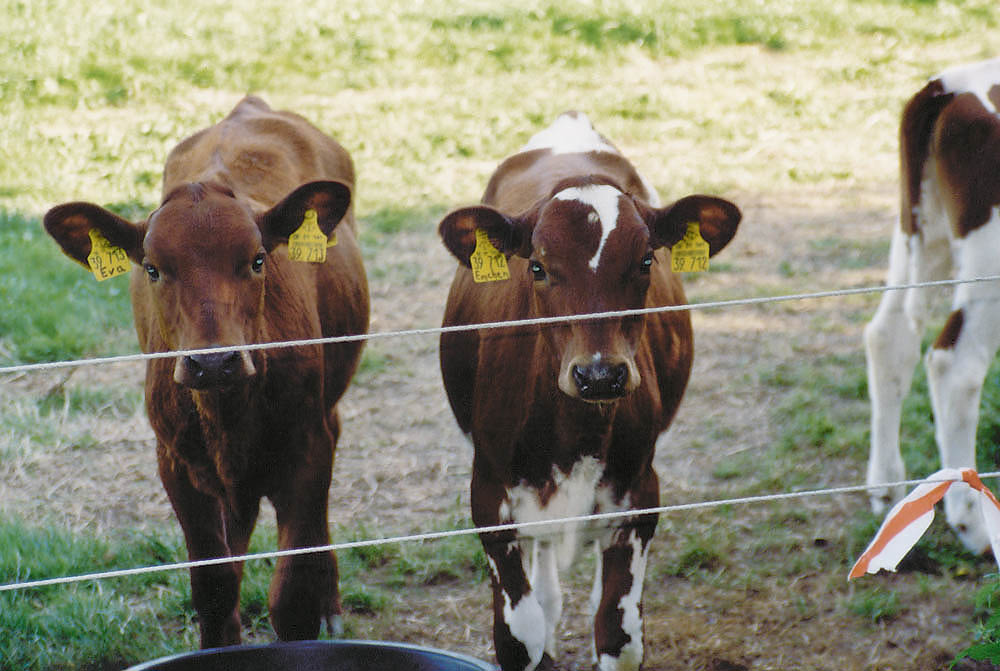 Die Rinder dieses landwirtschaftlichen Betriebes bekommen neben der Identifikationsnummer auf dem Ohr-Clip noch zusätzlich einen Namen. Das Kalb auf dem nebenstehenden Foto heisst "Emchen". Wenn Emchen nach mehreren Schwangerschaften zu alt für die profitorientierte Milchproduktion geworden ist, wird sie zum Schlachthof transportiert, per Bolzenschuss betäubt und durch einen vom Schlachter hervorgerufenen Entblutungsschnitt am Hals verbluten. Man wird ihren Kopf vom Körper trennen, die Organe und Innereien entnehmen und ihr "Fleisch" für Geld verkaufen. |