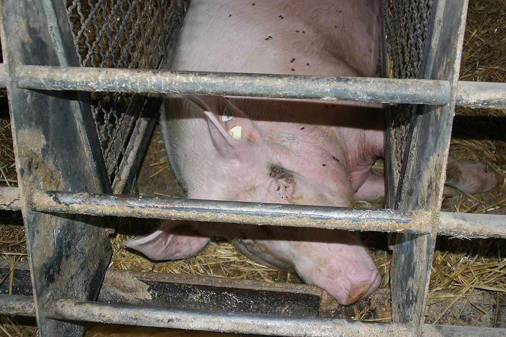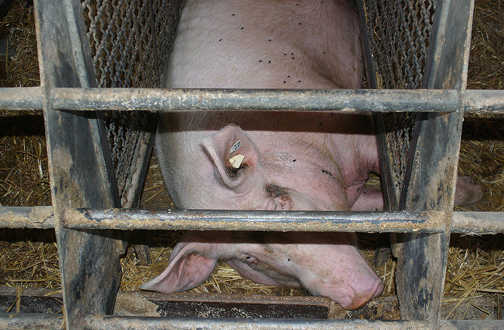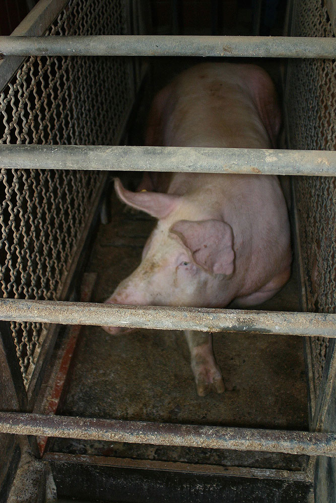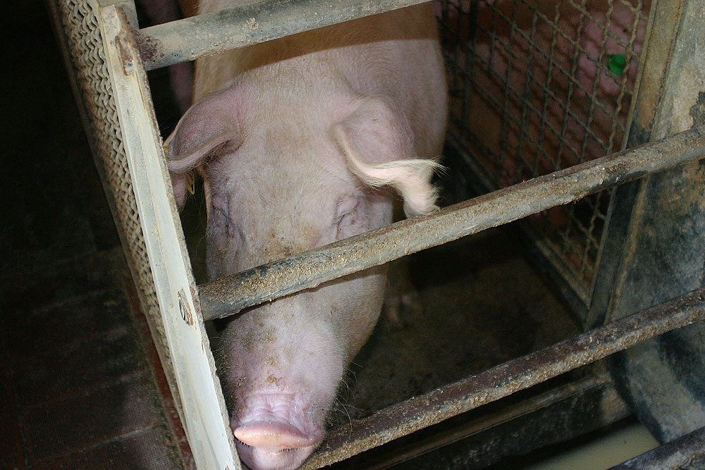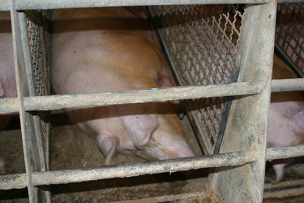 Die Schweine können sich kaum angemessen bewegen. Sie schlafen, essen, koten und urinieren in diesen eng unterteilten Käfigen. Die Tiere legen oftmals ein apathisches und emotional gestörtes Verhalten an den Tag. |