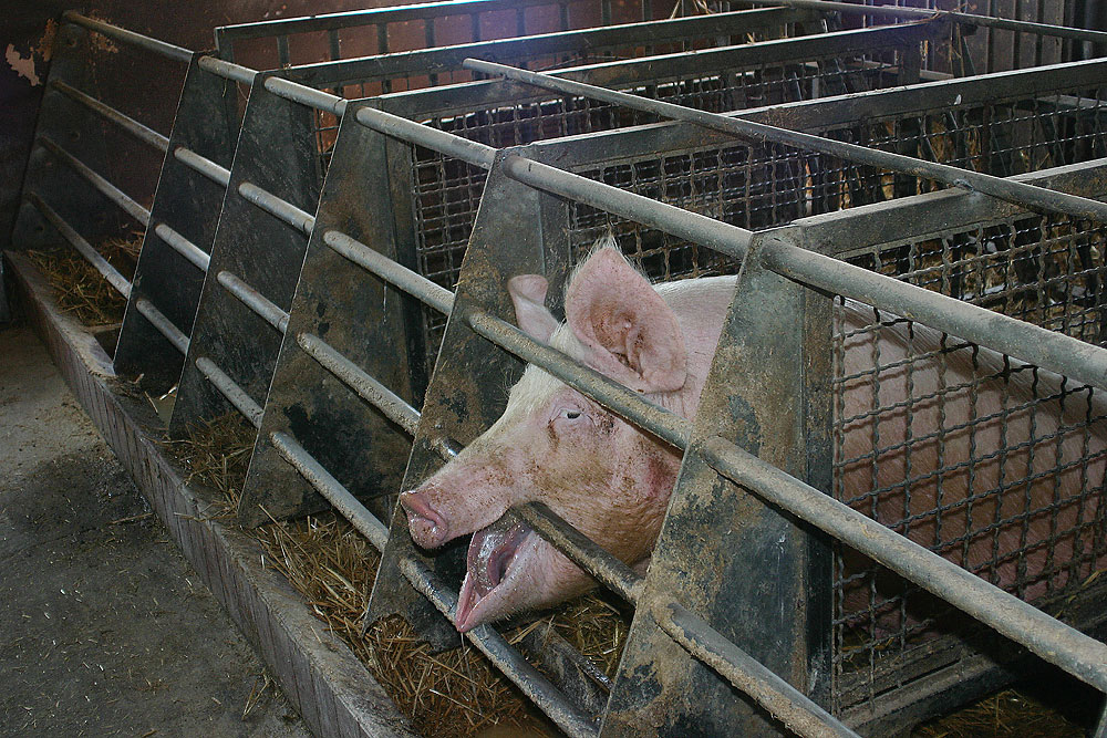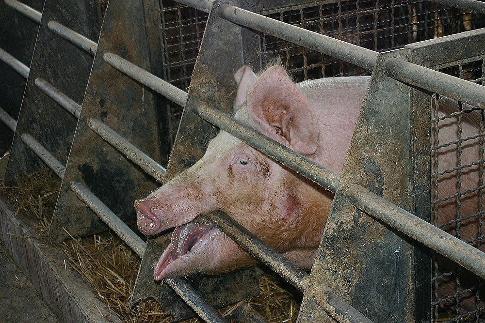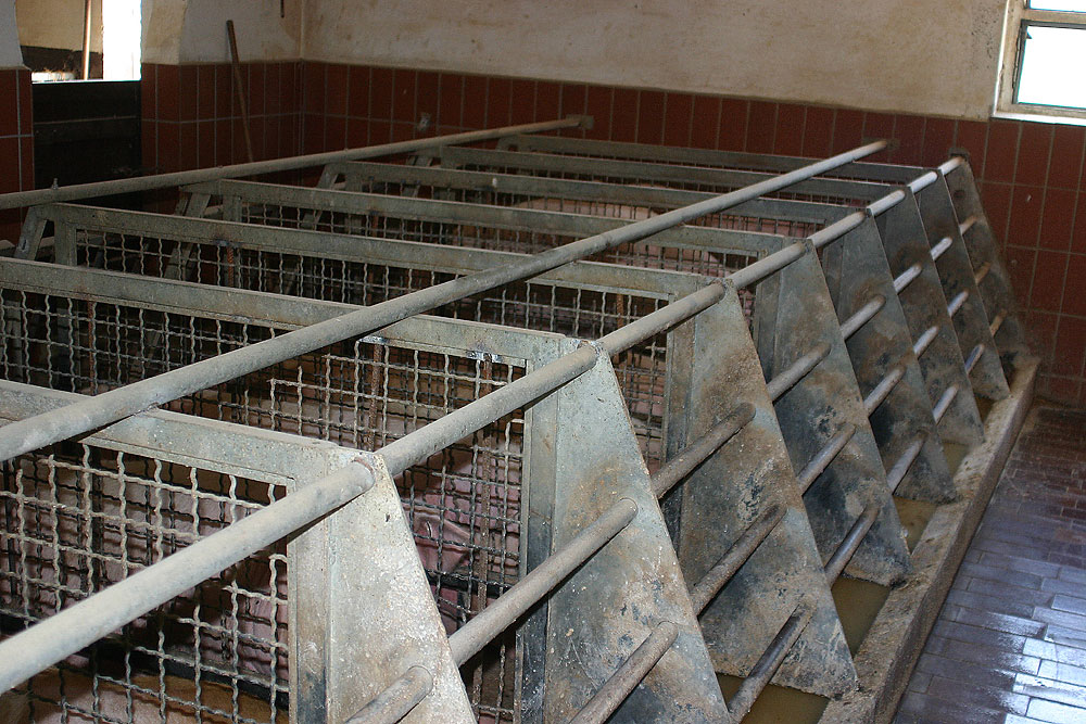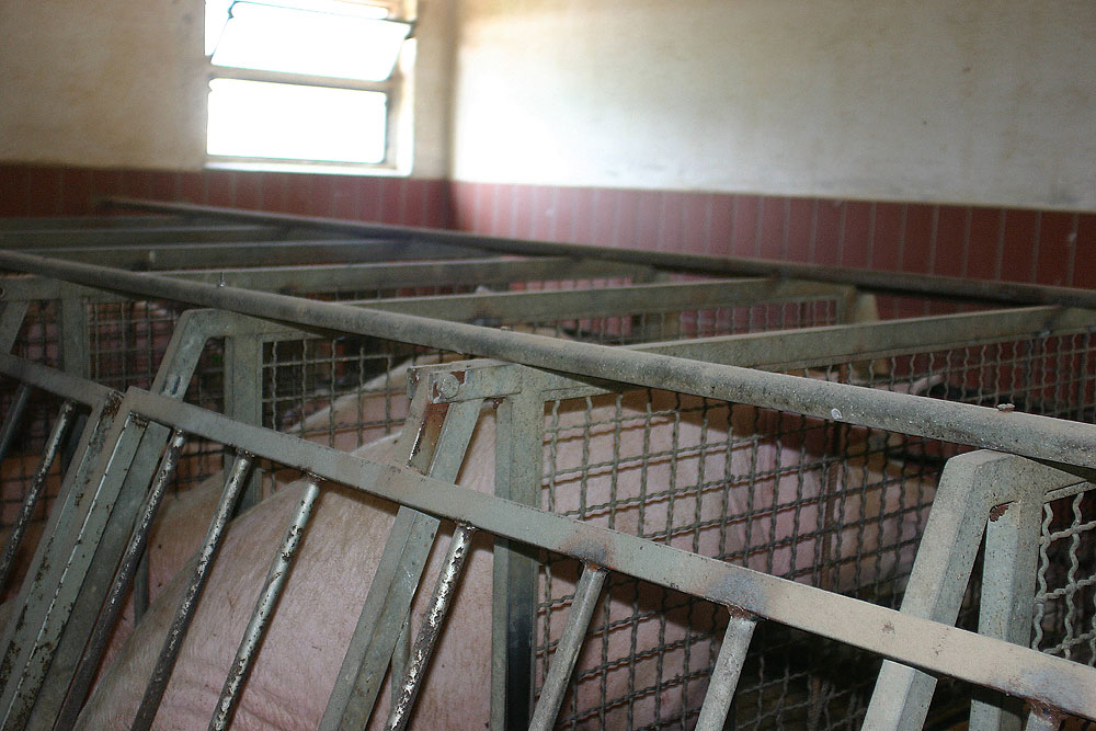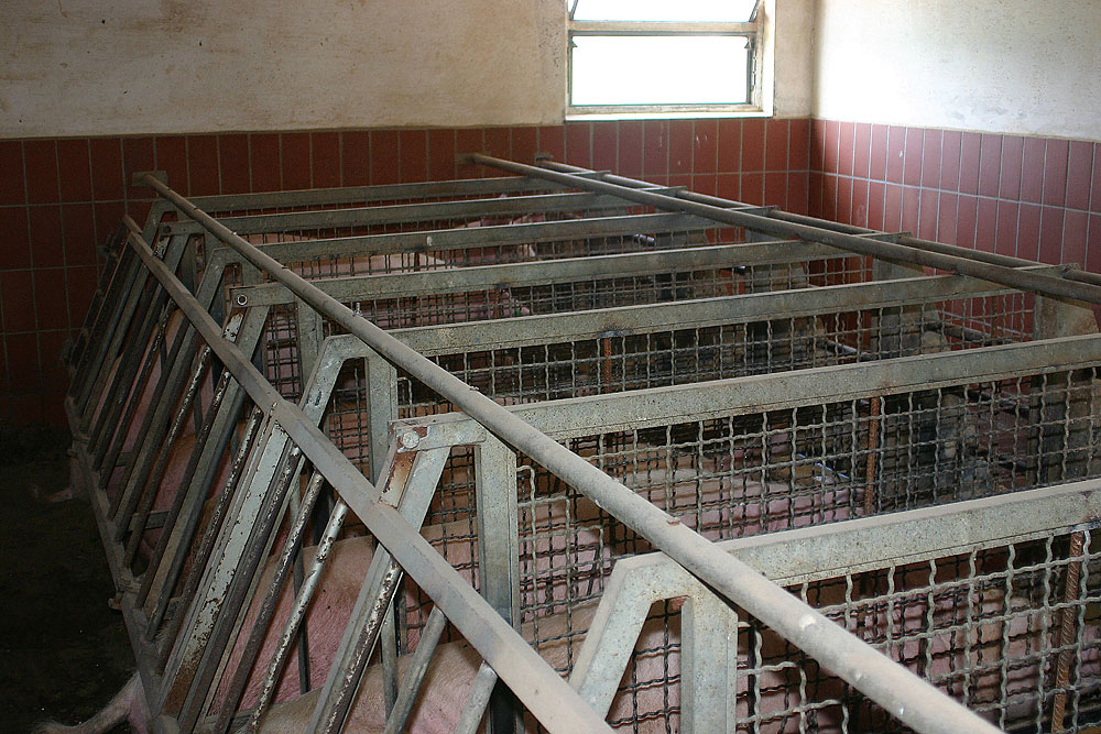 Diese Form der Schweinehaltung zeichnet sich dadurch aus, dass sich die Tiere jeweils getrennt voneinander in Boxen befinden. Ohne Auslauf und unter ständig akutem Platzmangel werden die einfühlsamen Schweine innerhalb der Gitterkonstruktionen gefangen gehalten. |