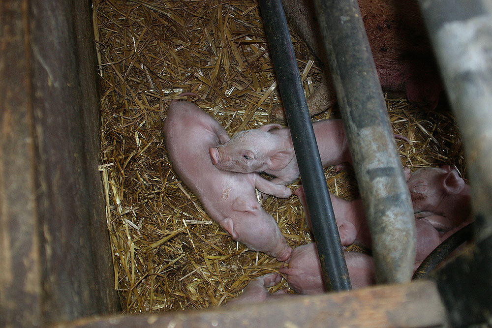 Diese Ferkel sind etwa zwei Tage alt. Die Tiere werden bereits nach wenigen Wochen von der Mutter getrennt. Das Leben dieser Tiere hat nur den einen Zweck: es handelt sich dabei um die gewinnbringende Produktion von Fleisch für den menschlichen Gebrauch. Die Tiere werden nach ihrer lebenslangen Gefangenhaltung in den Schlachthof transportiert, getötet, zerlegt, und als Ware verkauft. |