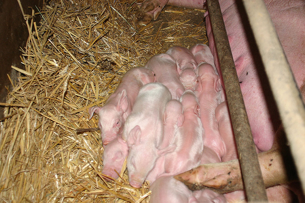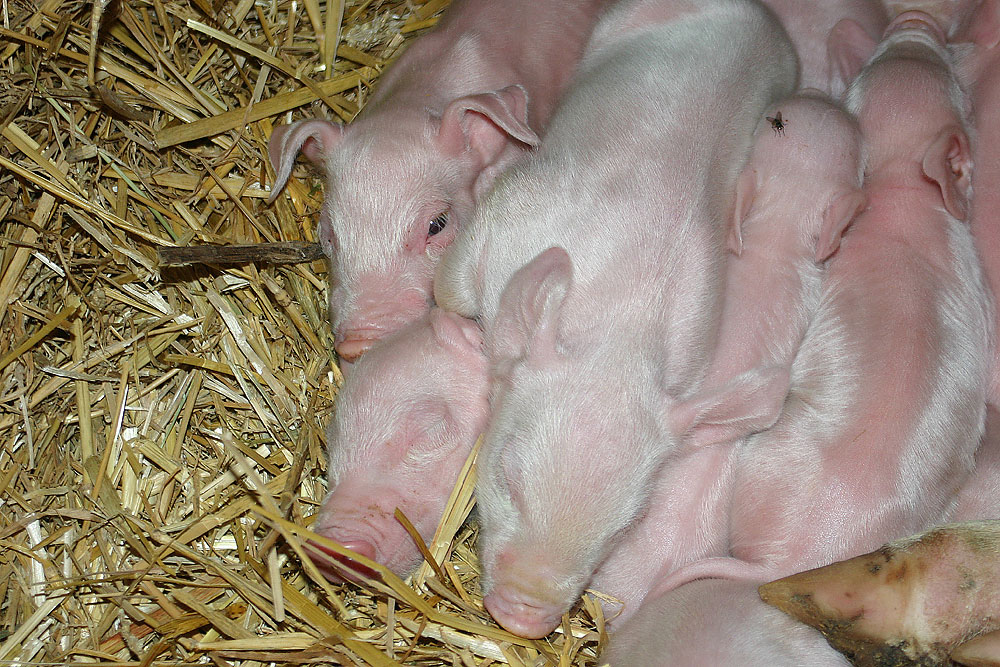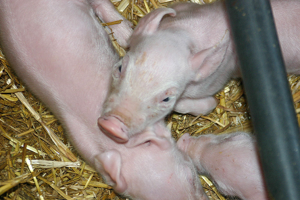 Diese jungen Ferkel sind ungefähr 24 Stunden alt. Nach einigen Wochen werden die männlichen Tiere, oftmals ohne Betäubung, kastriert. Dies geschieht folgerndermaßen: Das junge Tier wird mit gespreizten Beinen festgehalten oder so in eine Vorrichtung gesteckt. Durch einen Schnitt mit einem Skalpell wird der Hodensack links und rechts soweit aufgeschlitzt, dass durch die zugfügte Wunde der Hoden herausgedrückt werden kann. |