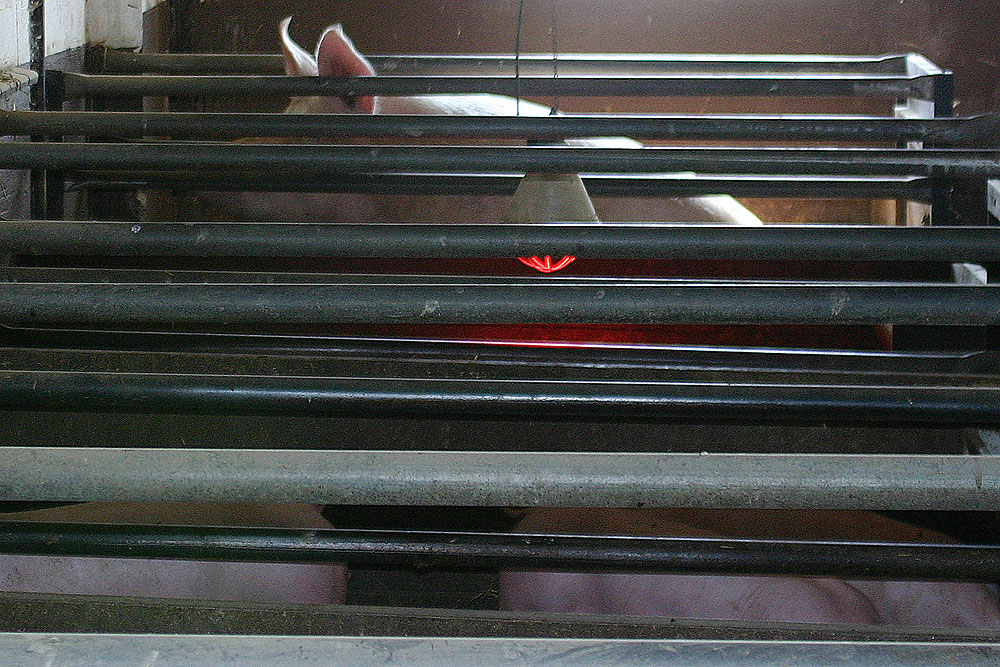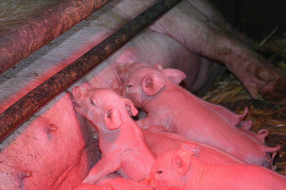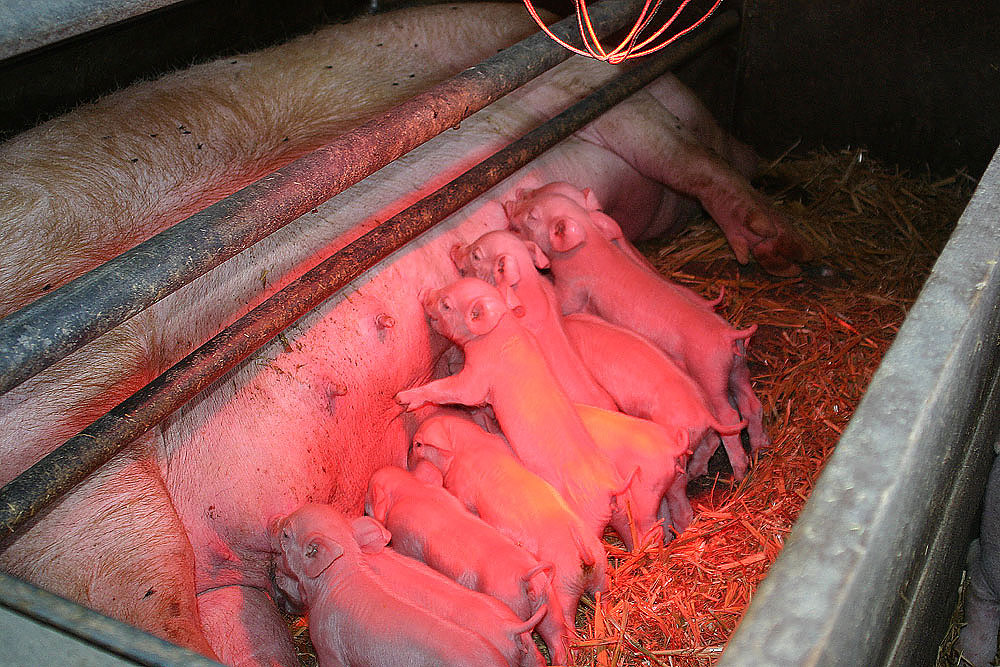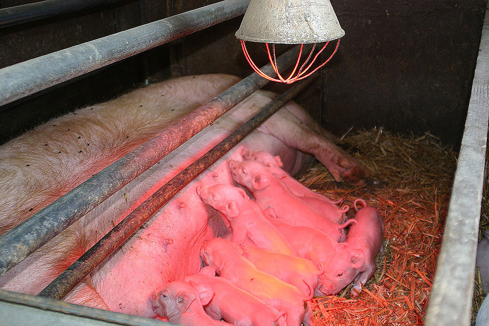zwischen den Gitterstäben, unter der Wärmelampe befinden sich auch Mütter mit ihren neugeborenen Ferkeln. |
