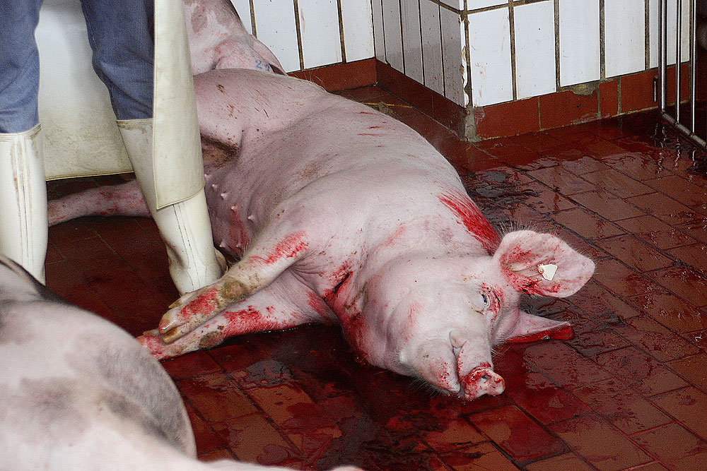 Ein Schwein liegt inmitten der eigenen Blutlache unter dem aufgehängten Schwein. Ein weiteres, noch lebendes Schwein bewegt sich zögernd durch den eingegrenzten Tötungsbereich. |