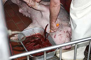 Das nebenstehende Foto zeigt, wie ein Schwein für die Schlachtung betäubt wird. Dazu werden dem Schwein Elektroden an den Kopf gesetzt. Durch das Anlegen einer Betäubungszange wird durch elektrische Spannung ein Strom erzeugt, der eine kurzfristige Betäubung des Tieres bewirkt. In größeren Schlachthäusern wird dieser Vorgang auch maschinell durchgeführt. Andernfalls werden Schweine vor der Schlachtung mit Kohlendioxid begast. |