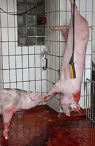 Das Schwein wird am rechten Hinterbein an einen Kettenzug befestigt. Die Entblutung wird in hängender Position fortgeführt. Dieses Foto verdeutlicht, dass die offene Verletzung und die angehende Tötung des Tieres direkt neben anderen noch lebenden Schweinen ausgeübt wird. |